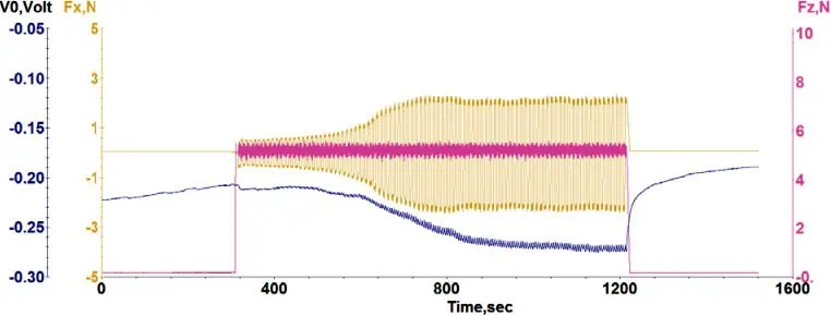 In the first 300 seconds no load was applied and the OCP value was about -0.220 volts. Then a load of 5 newtons was applied and a tribocorrosion test in sliding mode was performed for 900 seconds.