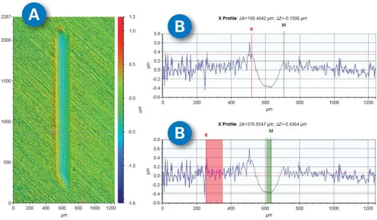 The wear scar was then studied with a 3D optical microscope (below). The wear scar was 232 microns wide and 0.217 microns deep: