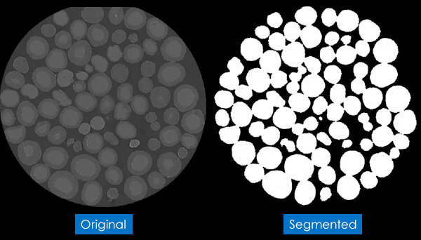 Usually, where particles or grains are stacked together, it’s difficult to study the properties of individual particles. Basic segmentation often selects the stack of particles altogether as a single cluster. This makes it difficult to quantify them individually. Any pores, particles or fibres that are touching are usually counted as one single object, so you can’t measure them individually.